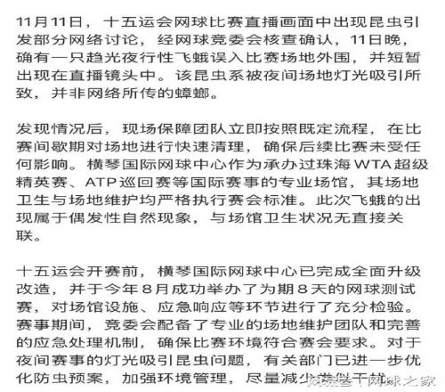 在事件发生24小时后,全运会网球竞赛委员会于9月13日晚间正式发布情况说明。这份通过官方渠道发布的声明显示:“经网球竞委会核查确认,12日晚,确有一只趋光夜行性飞蛾误入比赛场地外围,该昆虫在场地内短暂停留后即飞离,并未对比赛造成实际影响。”