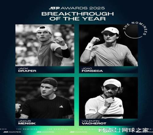 我们再来关注其它消息。北京时间今晨,ATP公布了2025赛季三个年度奖项的提名。其中,年度突破球员的提名是德雷珀、丰塞卡、门希克、瓦舍罗。