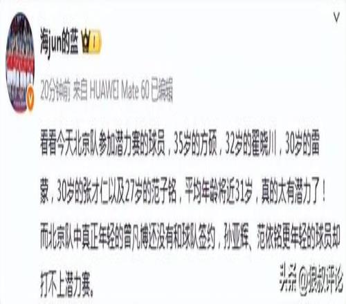 媒体人“海jun的蓝”发文点评:“看看今天北京队参加潜力赛的球员,35岁的方硕,32岁的翟晓川,30岁的雷蒙,30岁的张才仁以及27岁的范子铭,平均年龄将近31岁,真的太有潜力了!