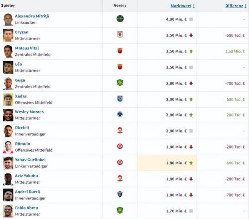 北京国安的古加从350万欧降到了280万欧,排名第五。青岛西海岸的里切利、深圳新鹏城的韦斯利、天津津门虎的哈达斯同为200万欧,并列第六。云南玉昆的布尔克、青岛西海岸的阿齐兹、成都蓉城的古尔芬克尔和罗慕洛四人同为180万欧,并列第九。
