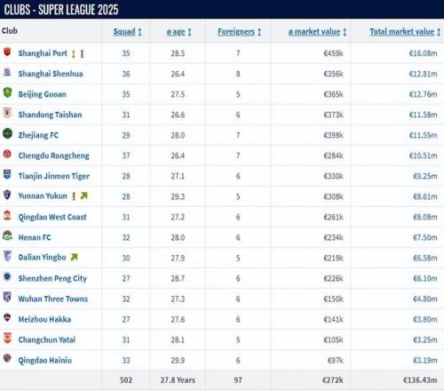 球队总体的身价表现,2025赛季中超联赛冠军上海海港全队身价最高,达到1608万欧元。亚军上海申花全队的身价紧随其后,达到1281万欧元。中国足协杯冠军北京国安全队的身价为1276万欧元,排名第三位。