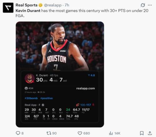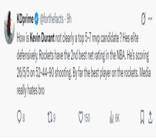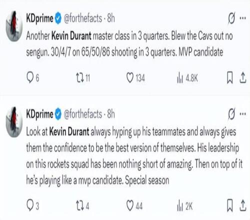 休媒:杜兰特三节打卡拿到30+4+7,三项命中率65/50/86,他再一次打出了MVP的数据。看看凯文-杜兰特,他总是激励队友,让队友们充满信心,展现出最出色的一面。他在火箭队的领导能力堪称一流。不仅如此,他过去三个赛季的表现都堪称 MVP。这个赛季堪称非凡的赛季。