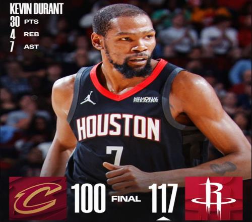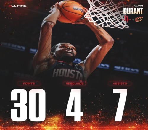 火箭队117-100大胜骑士拿到二连胜,火箭队也凭借这一波二连胜重返西部第四,这个夜晚马刺、掘金都遭到了爆冷,而火箭队在没有核心阿尔佩伦-申京的情况下大胜骑士队,凯文-杜兰特甚至三节打卡拿到30+。