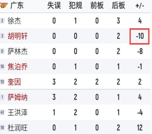 依旧很难评,按广东队的阵容本可以不用打的这么艰难的,只能说这一场又有人拖后腿了,首当其冲的正是胡明轩,上半场0分,下半场仅得3分,其次是张皓嘉和王洪泽,张皓嘉本场仅得3分对位防不住贺希宁、史密斯,王洪泽只有1分1板,完全被周鹏、王浩然碾压,撞到新秀墙了。