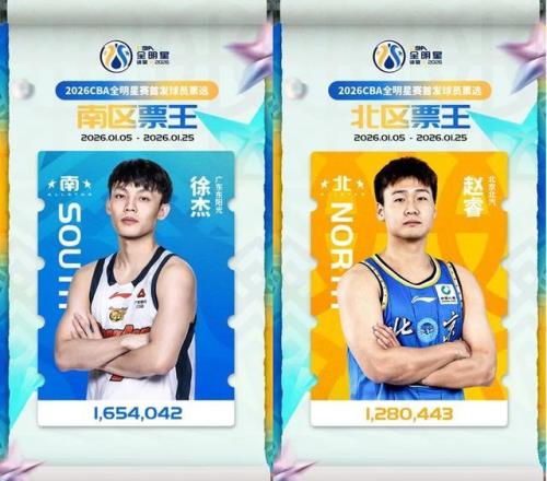 今天下午,CBA联赛官方正式公布2026年CBA全明星赛首发球员票选结果。广东队后卫徐杰以1,654,042票当选南区票王及总票王,北京队后卫赵睿则以1,280,443票荣膺北区票王。