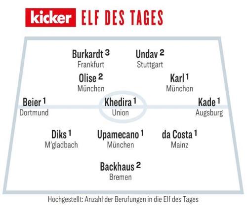 德媒《踢球者》评选德甲第11轮最佳阵容,卡尔、奥利塞、于帕梅卡诺、拜尔入选。守门员:巴克豪斯(不莱梅)后卫:迪克斯(门兴)、于帕梅卡诺(拜仁)、丹尼-达科斯塔(美因茨)中场:拜尔(
